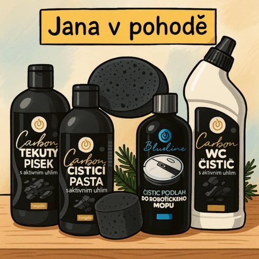 Tentokrát mi v nákupním košíku přistály tyto výrobky: Čistící pasta s aktivním uhlím, Tekutý písek s aktivním uhlím, WC čistící GEL s aktivním uhlím a Čistič podlah do robotického mopu