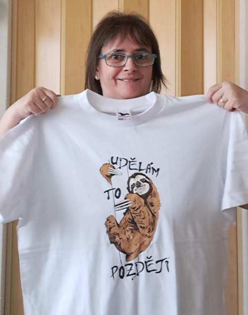 Druhé tričko je s lenochodem a nápisem„Udělám to později“.
