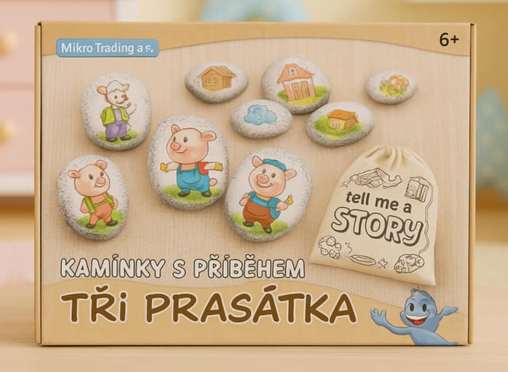 V balení najdete v krabičce krásné a čisté kamínky, připravené ke tvoření. V krabičce jsou i samolepky, které v podstatě „vyprávějí“ pohádku o prasátkách.