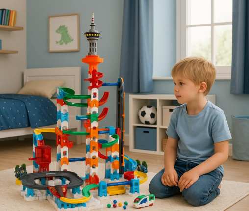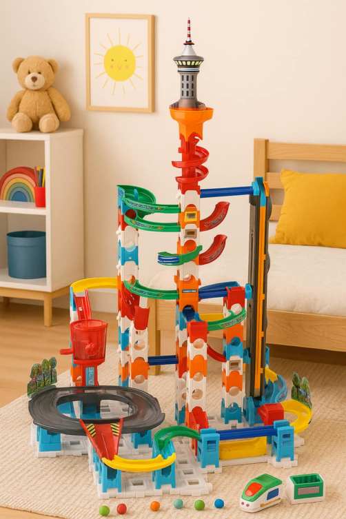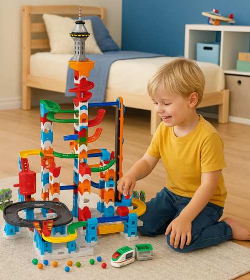 Stavba dráhy rozvíjí dovednosti dětí - jemnou motoriku, představivost, kreativitu a logické myšlení.(sledování trasy kuličky).