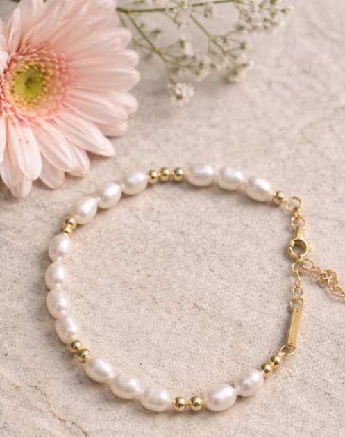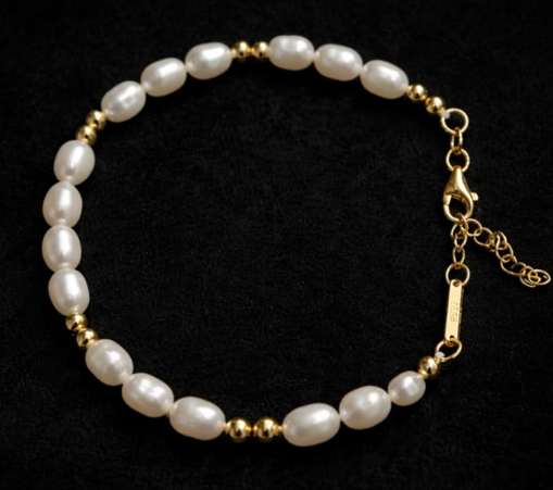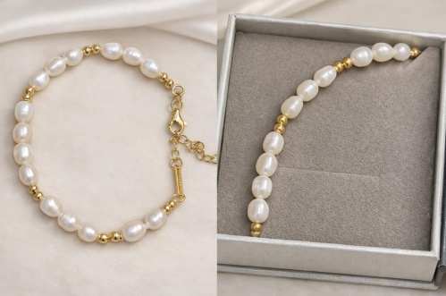 Perličky jsou drobné, a jsou doplněné o drobné pozlacené kuličky. Díky tomu doplnění o kuličky lze náramek nosit ke společenským šatům, ale zároveň i v létě k šatům letním. To mám moc ráda, když můžu šperk nosit kdykoliv a k čemukoliv – variabilita je důležitá.